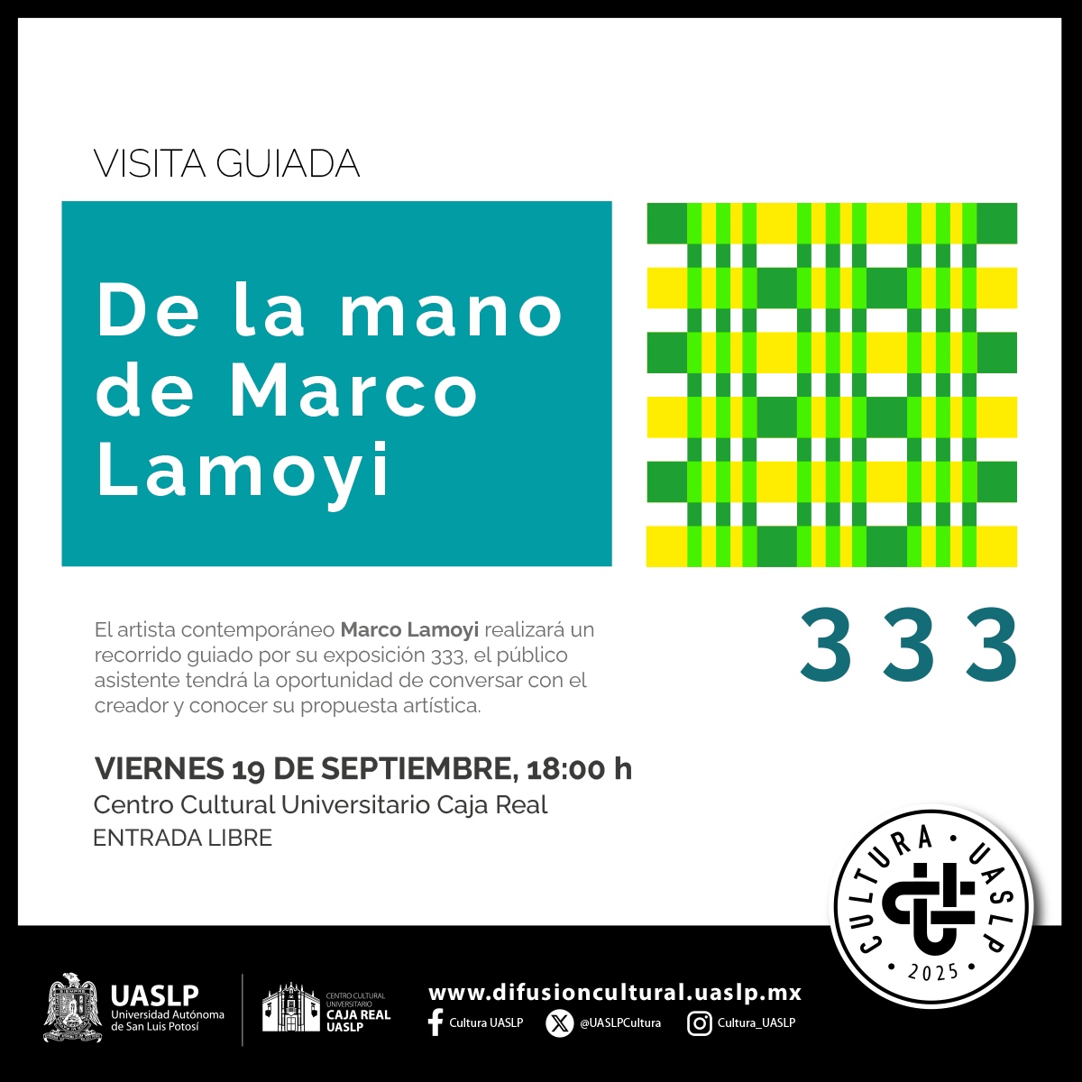 Además, el viernes 19 de septiembre a las 18:00 h. el artista dará un recorrido por su obra 333. Misma que se exhibe en el Centro Cultural Universitario Caja Real. Durante esta presentación los asistentes tendrán oportunidad de dialogar con el artista y conocer su propuesta artística.