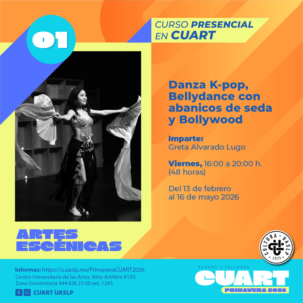 | Imparte: Greta Alvarado Lugar: Centro Universitario de las artes (CUART) Modalidad: Presencial Fechas: Del 13 de febrero al 16 de mayo del 2026 Horarios: Viernes de 16:00 a 20:00 Costo: Inscripción Curricular: Sin costo Inscripción no curricular: $ 500.00 Duración: 48 horas Cupo: 23 *Cursos y talleres exclusivos para estudiantes en activo de licenciatura y posgrado de la UASLP. *Los materiales van por cuenta del estudiante. |