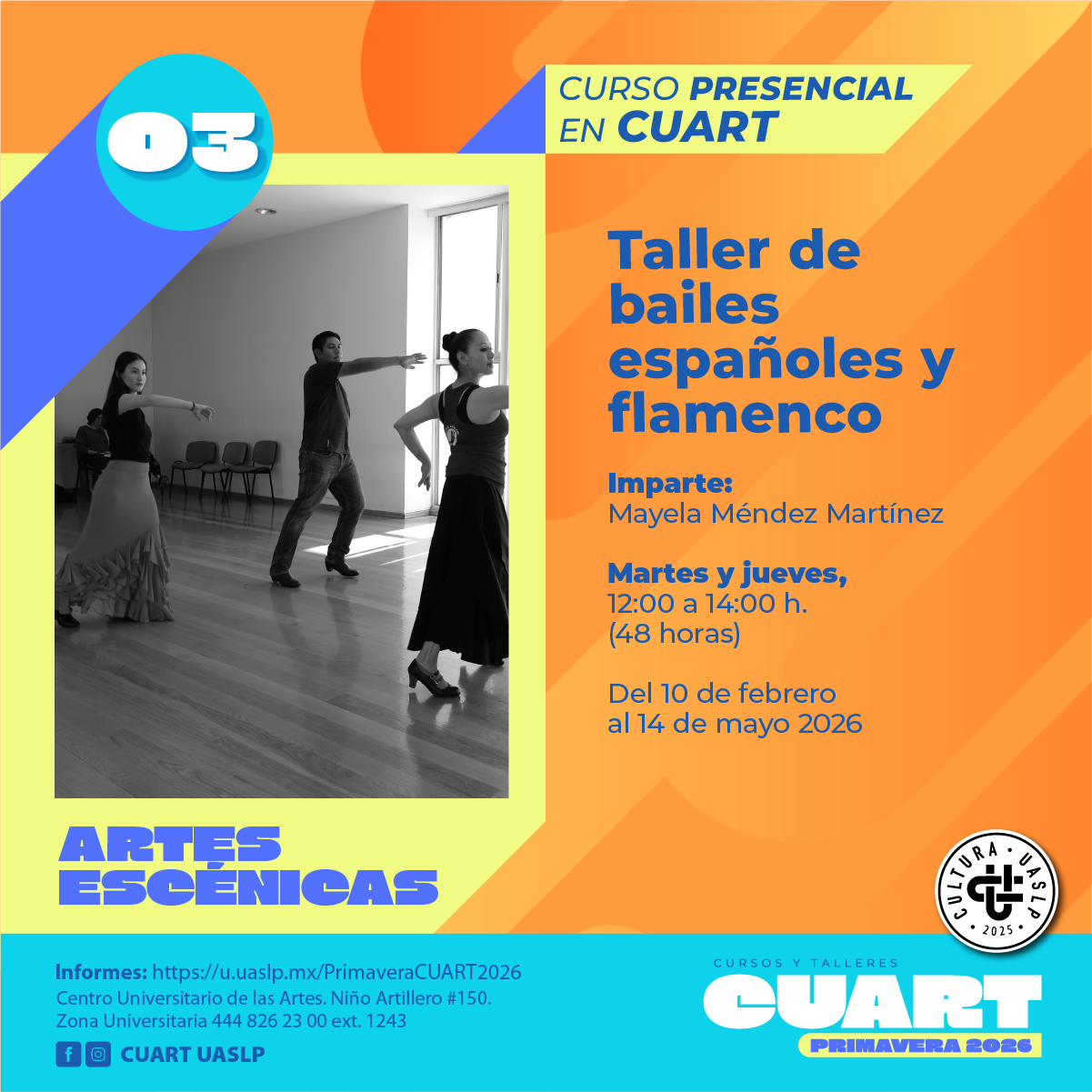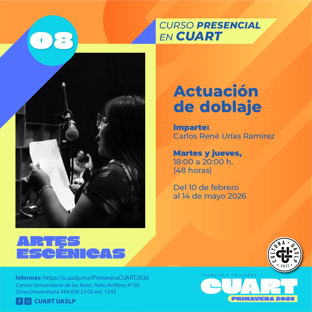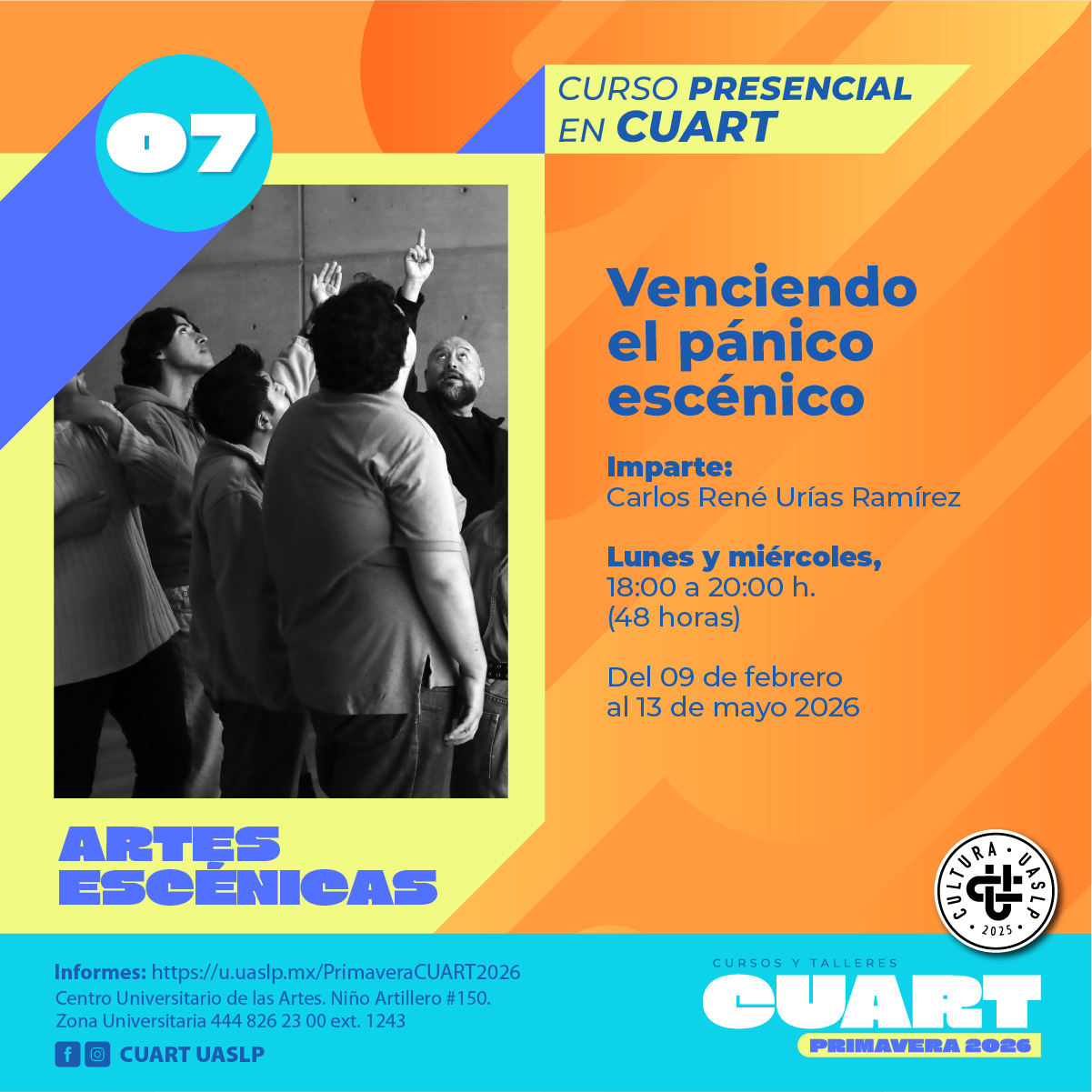 | Imparte: Mayela Méndez Martínez Lugar: Centro Universitario de las artes (CUART) Modalidad: Presencial Fechas: Del 10 de Febrero al 14 de mayo del 2026 Horarios: Martes y jueves de 12:00 a 14:00 Costo: Inscripción Curricular: Sin costo; Inscripción no curricular: $ 500.00 Duración: 48 horas Cupo: 12 *Cursos y talleres exclusivos para estudiantes en activo de licenciatura y posgrado de la UASLP.