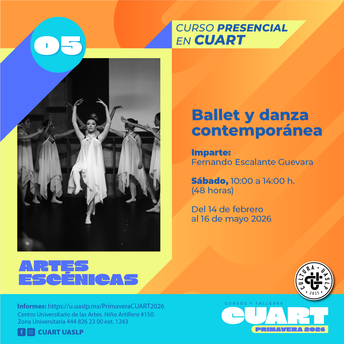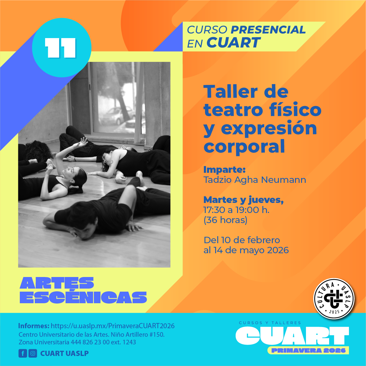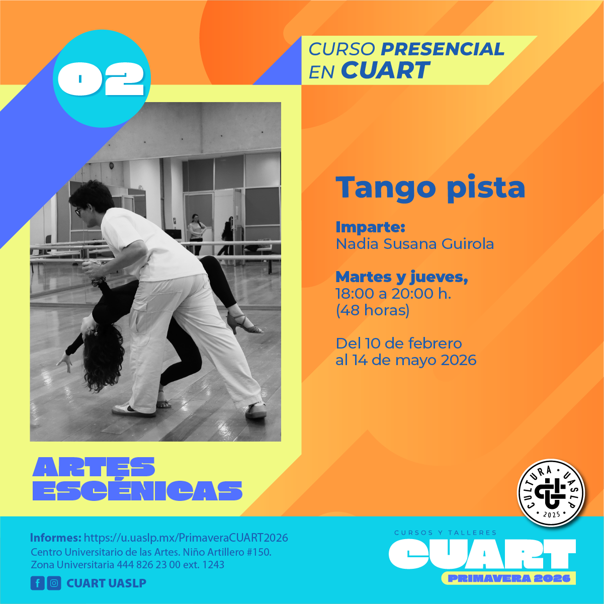 | Imparte: Mayela Méndez Martínez Lugar: Centro Universitario de las artes (CUART) Modalidad: Presencial Fechas: Del 10 de Febrero al 14 de mayo del 2026 Horarios: Martes y jueves de 12:00 a 14:00 Costo: Inscripción Curricular: Sin costo; Inscripción no curricular: $ 500.00 Duración: 48 horas Cupo: 12 *Cursos y talleres exclusivos para estudiantes en activo de licenciatura y posgrado de la UASLP.