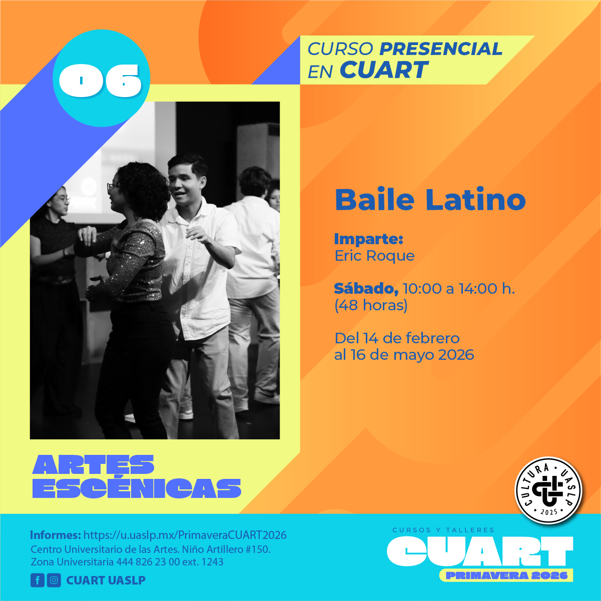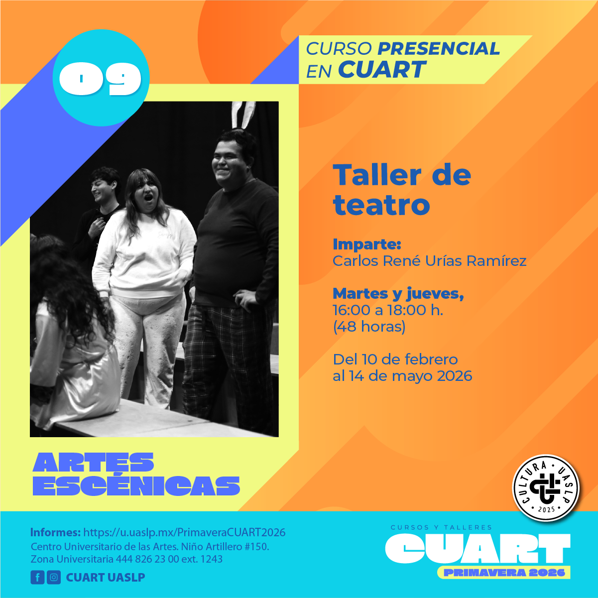| Imparte: Carlos René Urías Ramírez Lugar: Centro Universitario de las artes (CUART) Modalidad: Presencial Fechas: Del 10 de febrero al 14 de mayo del 2026 Horarios: Martes y jueves de 18:00 a 20:00 Costo: Inscripción Curricular: Sin costo Inscripción no curricular: $ 500.00 Duración: 48 horas Cupo: 16 *Cursos y talleres exclusivos para estudiantes en activo de licenciatura y posgrado de la UASLP. *Los materiales van por cuenta del estudiante. |