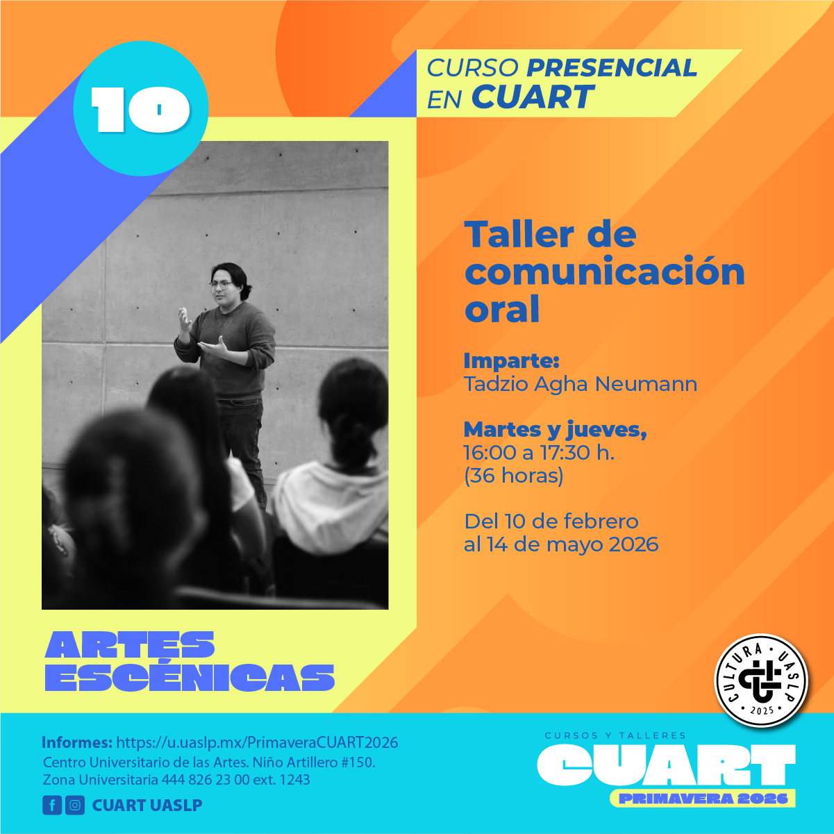| Imparte: Tadzio Agha Neumann Lugar: Centro Universitario de las artes (CUART) Modalidad: Presencial Fechas: Del 10 de febrero al 14 de mayo del 2026 Horarios: Martes y jueves 17:30 a 19:00 Costo: Inscripción Curricular: Sin costo; Inscripción no curricular: $ 500.00 Duración: 36 horas Cupo: 15