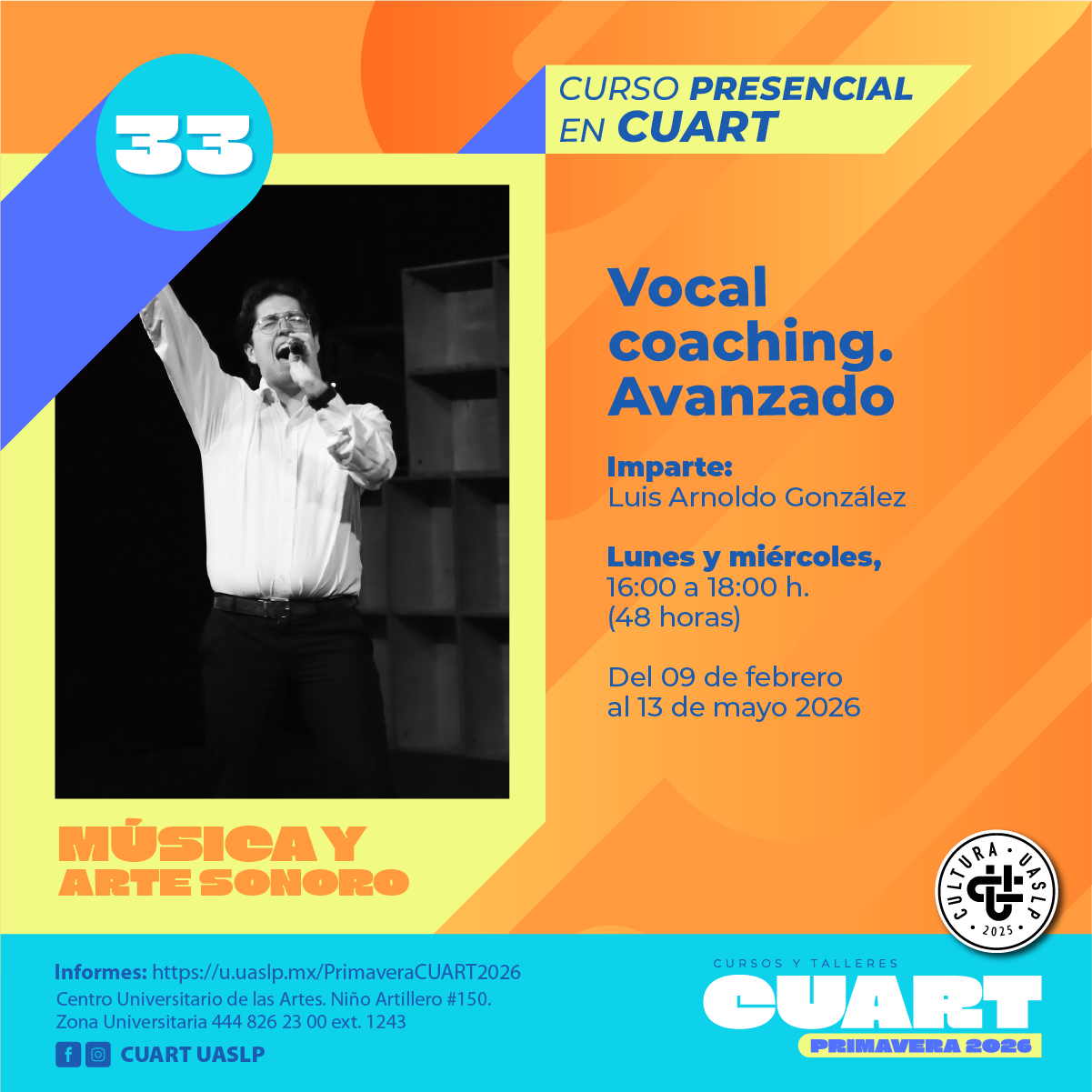 | Imparte: Luis Arnoldo Gonzáles Lugar: Centro Universitario de las artes (CUART) Modalidad: Presencial Fechas: Del 9 de febrero al 13 de mayo del 2026 Horarios: Lunes y miércoles de 16:00 a 18:00 Costo: Inscripción Curricular: Sin costo;