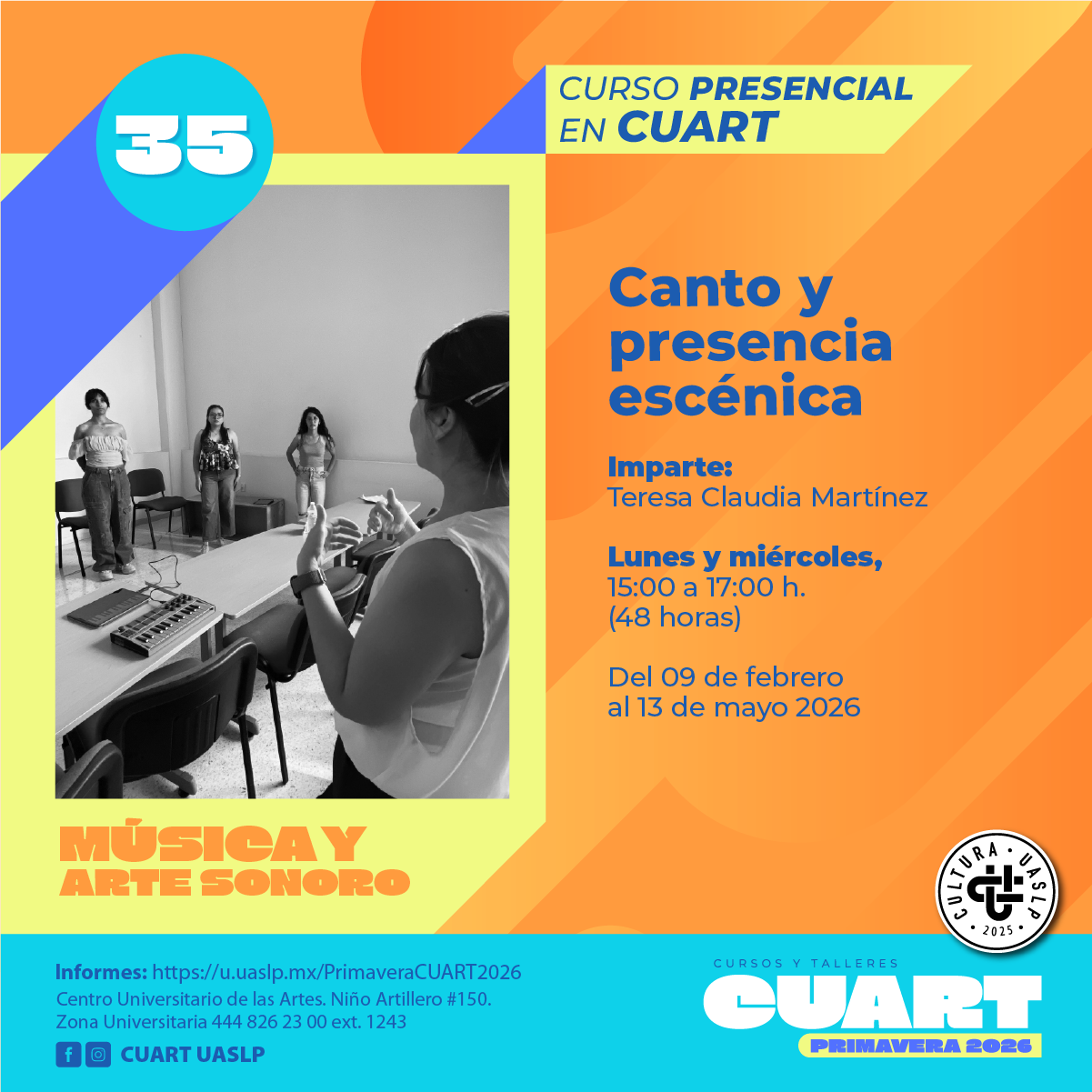 | Imparte: Teresa Claudia Martínez Lugar: Centro Universitario de las artes (CUART) Modalidad: Presencial Fechas: Del 9 de febrero al 13 de mayo del 2026 Horarios: Lunes y miércoles de 15:00 a 17:00 Costo: Inscripción Curricular: Sin costo;