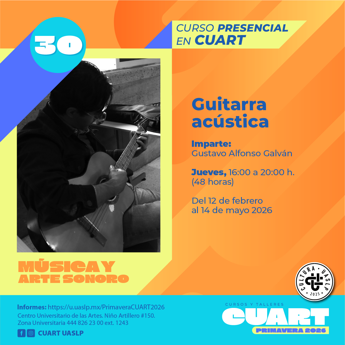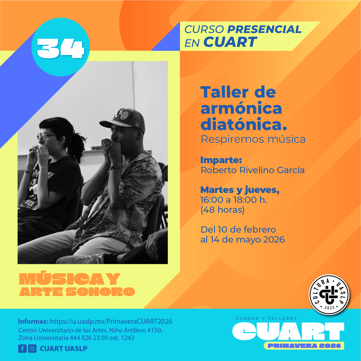 | Imparte: Roberto Rivelino García Lugar: Centro Universitario de las artes (CUART) Modalidad: Presencial Fechas: Del 10 de febrero al 14 de mayo del 2026 Horarios: Martes y jueves de 16:00 a 18:00 Costo: Inscripción Curricular: Sin costo;