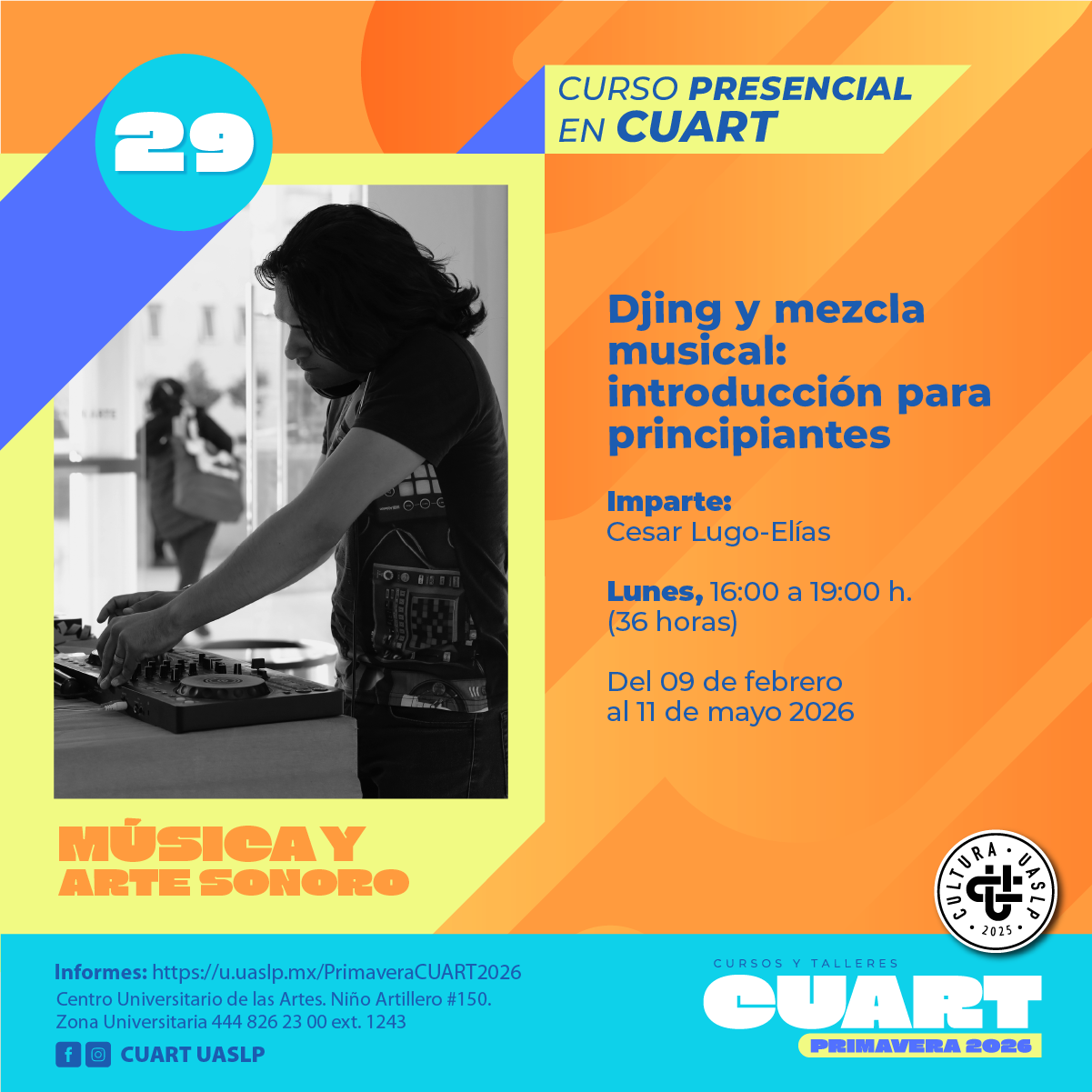 | Imparte: César Lugo-Elías Lugar: Centro Universitario de las artes (CUART) Modalidad: Presencial Fechas: Del 9 de febrero al 11 de mayo del 2026 Horarios: Lunes de 16:00 a 19:00 Costo: Inscripción Curricular: Sin costo;