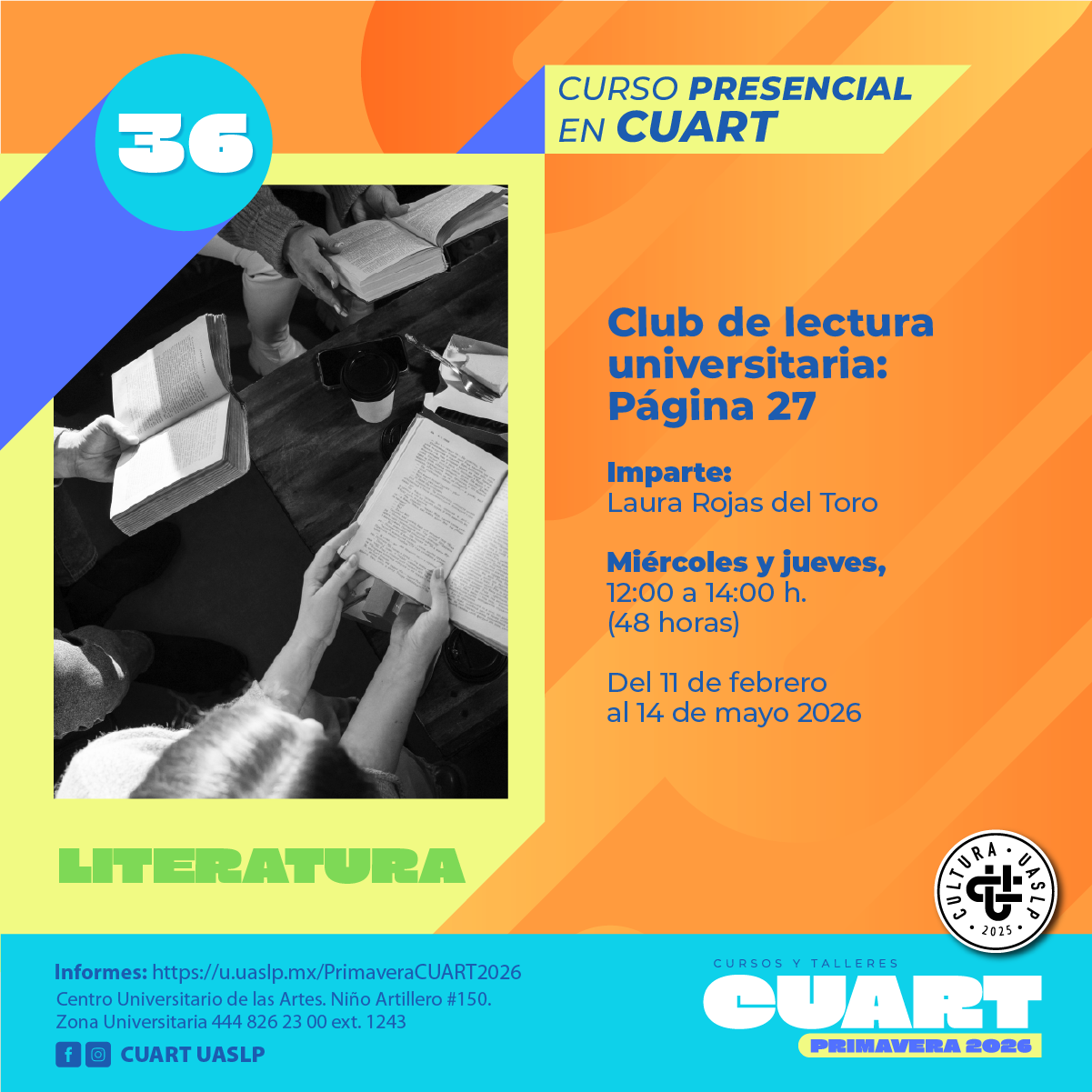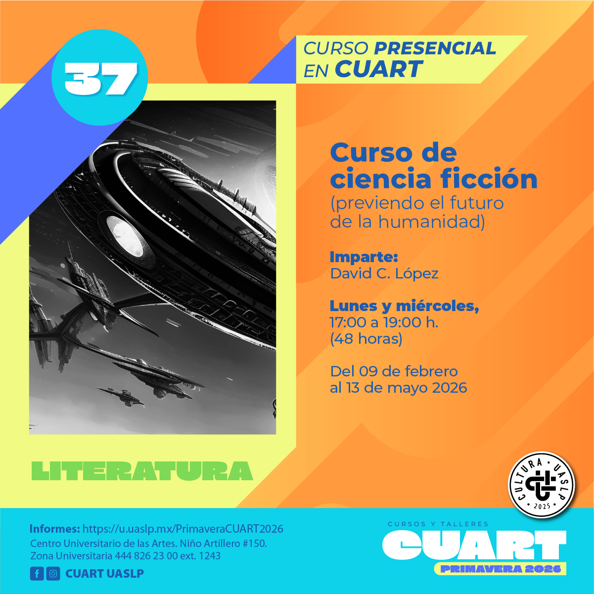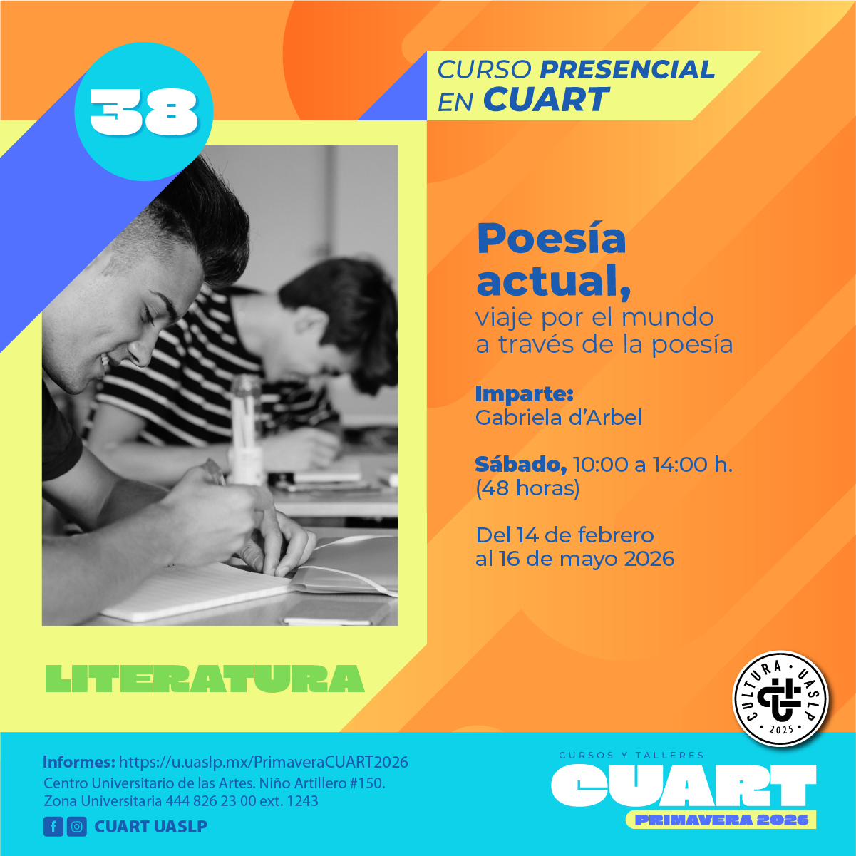 | Imparte: David C. López Lugar: Centro Universitario de las artes (CUART) Modalidad: Presencial Fechas: Del 09 de febrero al 13 de mayo del 2026 Horarios: Lunes y miércoles de 17:00 a 19:00 Costo: Inscripción Curricular: Sin costo;