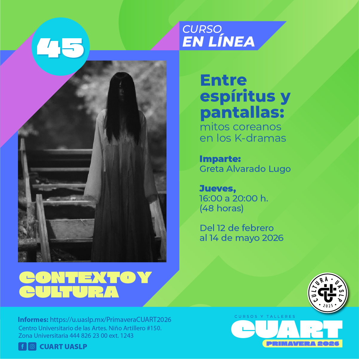| Imparte: Greta Alvarado Lugo Plataforma: Microsoft Teams Modalidad: En línea Fechas: Del 12 de febrero al 14 de mayo del 2026 Horarios: Jueves de 16:00 a 20:00 Costo: Inscripción Curricular: Sin costo;