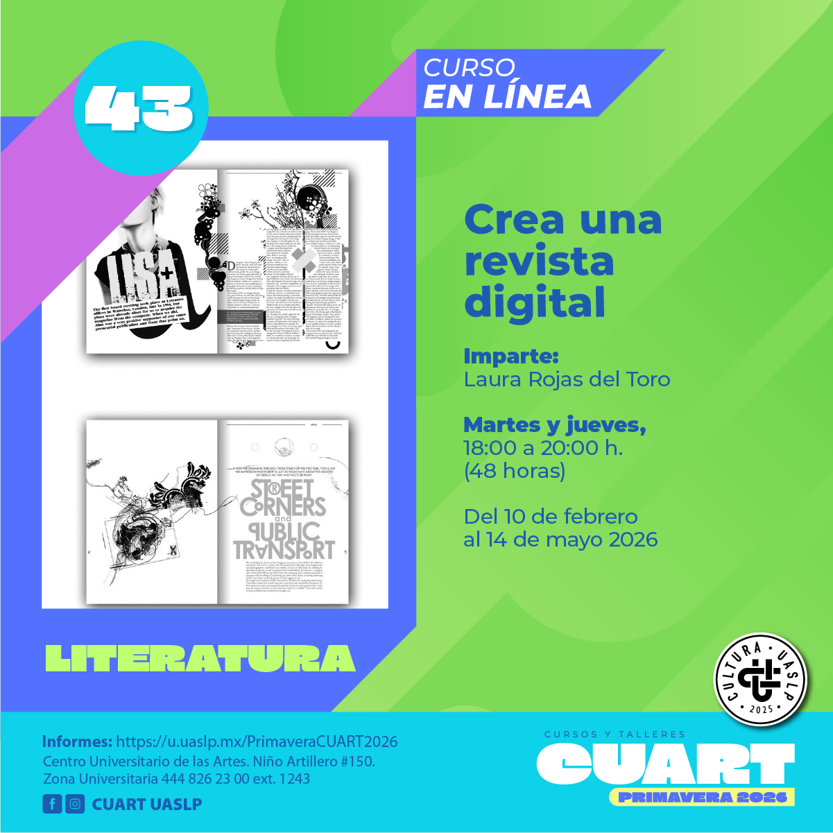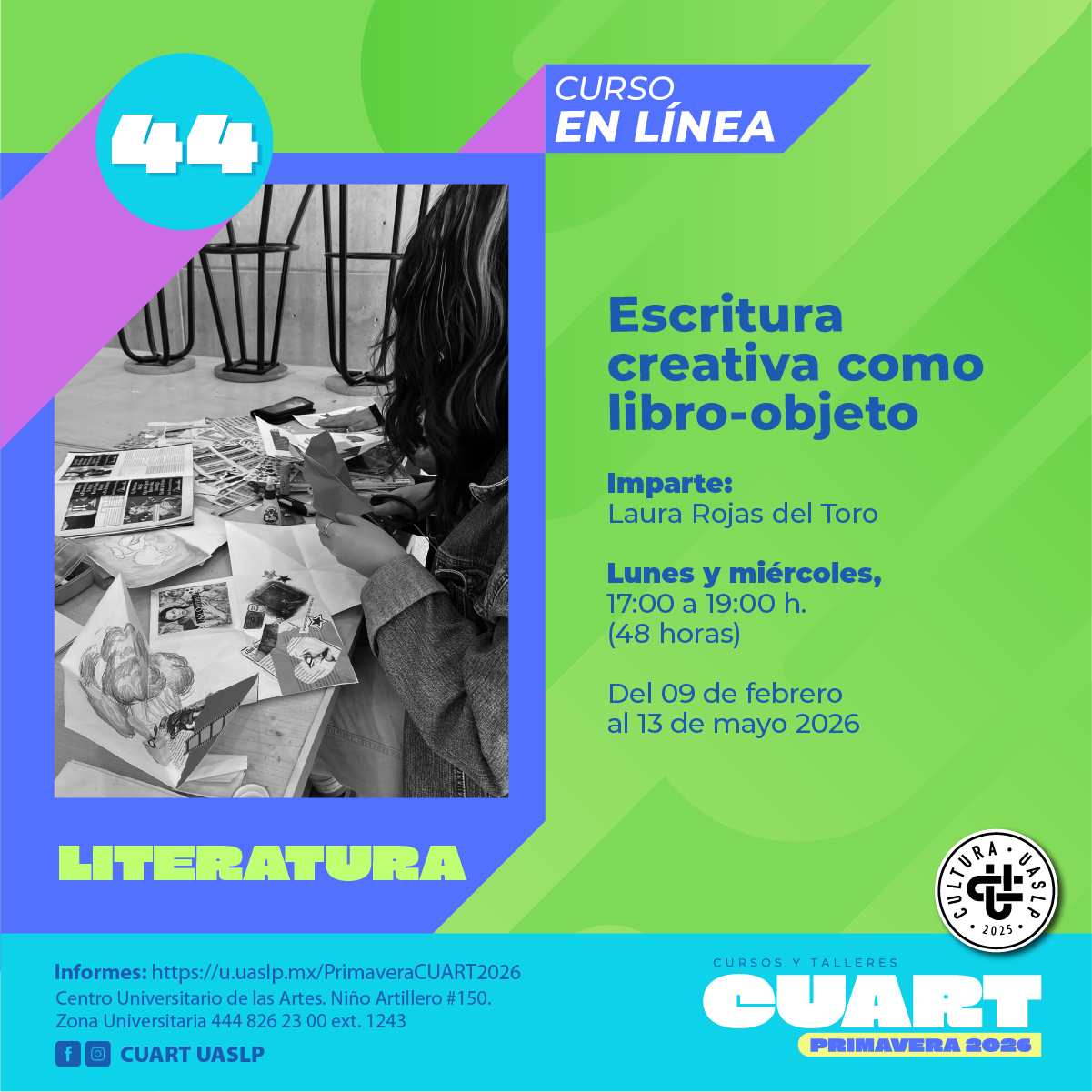 | Imparte: Laura Rojas del Toro Plataforma: Microsoft Teams Modalidad: En línea Fechas: Del 10 de febrero al 14 de mayo del 2026 Horarios: Martes y jueves de 18:00 a 20:00 Costo: Inscripción Curricular: Sin costo;