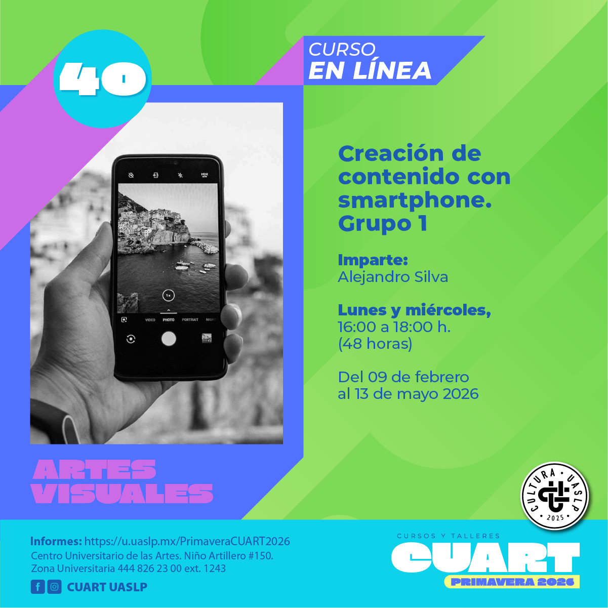 | Imparte: Alejandro Silva Plataforma: Microsoft Teams Modalidad: En línea Fechas: Del 09 de febrero al 13 de mayo del 2026 Horarios: Lunes y miércoles de 16:00 a 18:00 Costo: Inscripción Curricular: Sin costo;