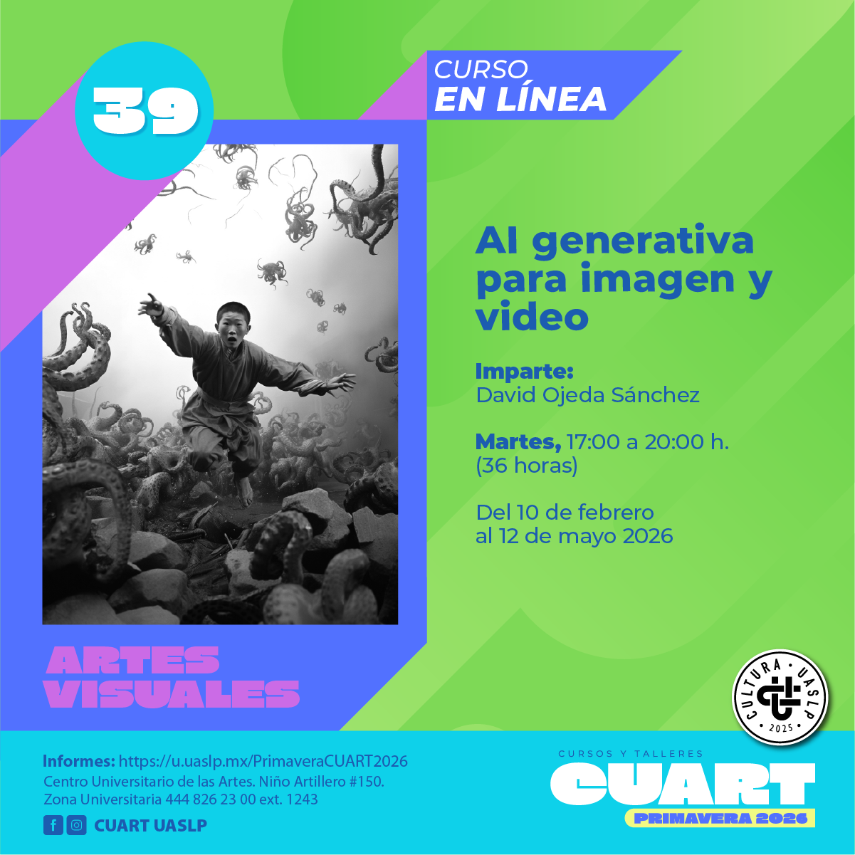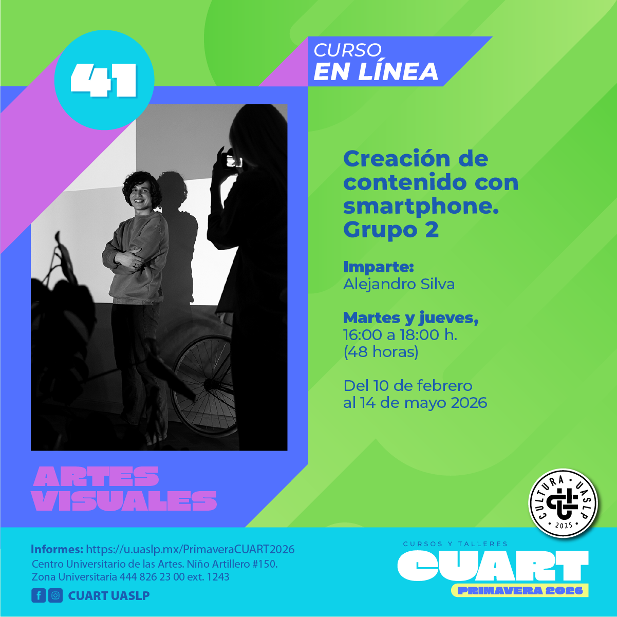 | Imparte: Alejandro Silva Plataforma: Microsoft Teams Modalidad: En línea Fechas: Del 10 de febrero al 14 de mayo del 2026 Horarios: Martes y jueves de 16:00 a 18:00 Costo: Inscripción Curricular: Sin costo;